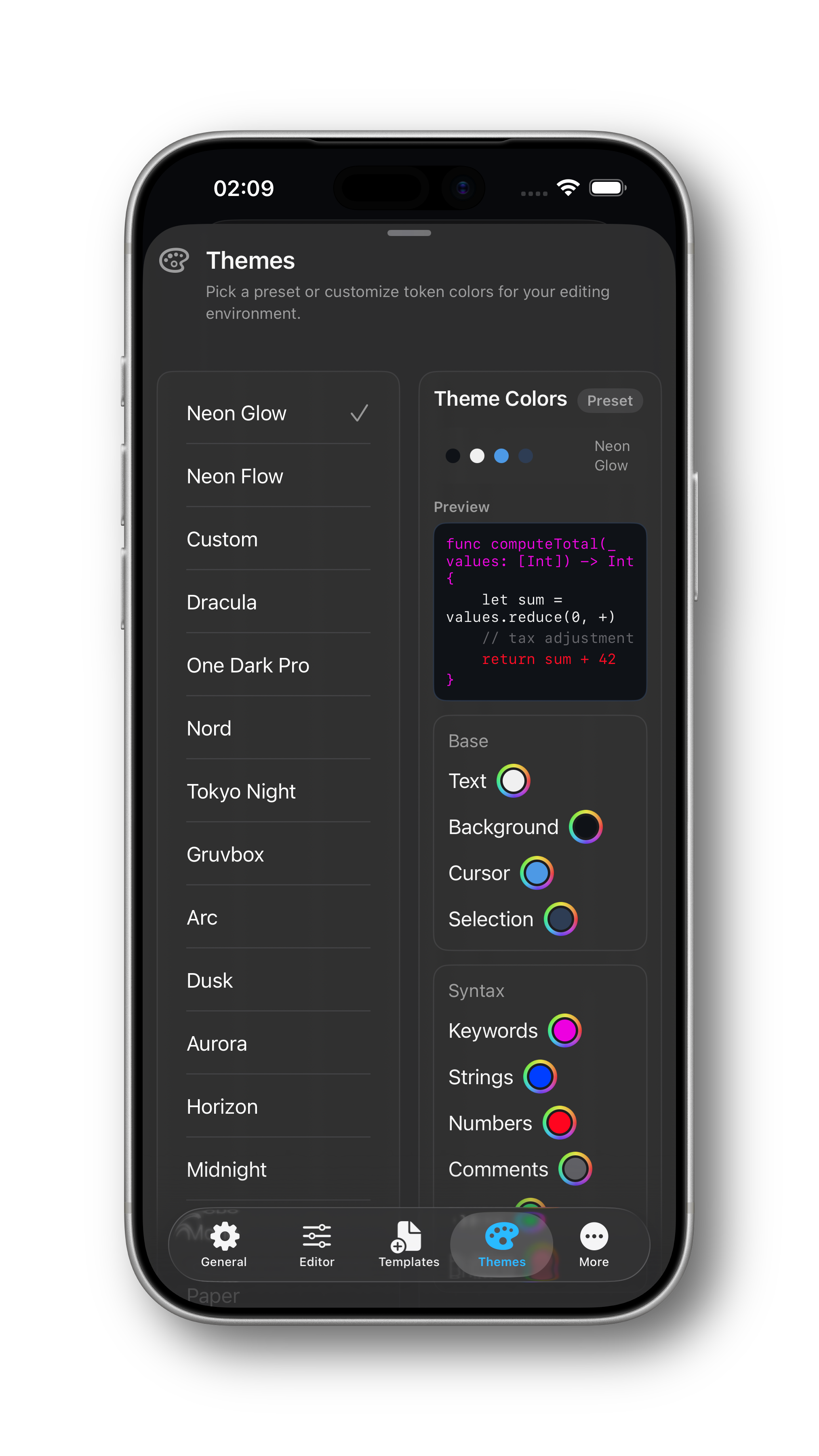 Dark-theme editing preview |