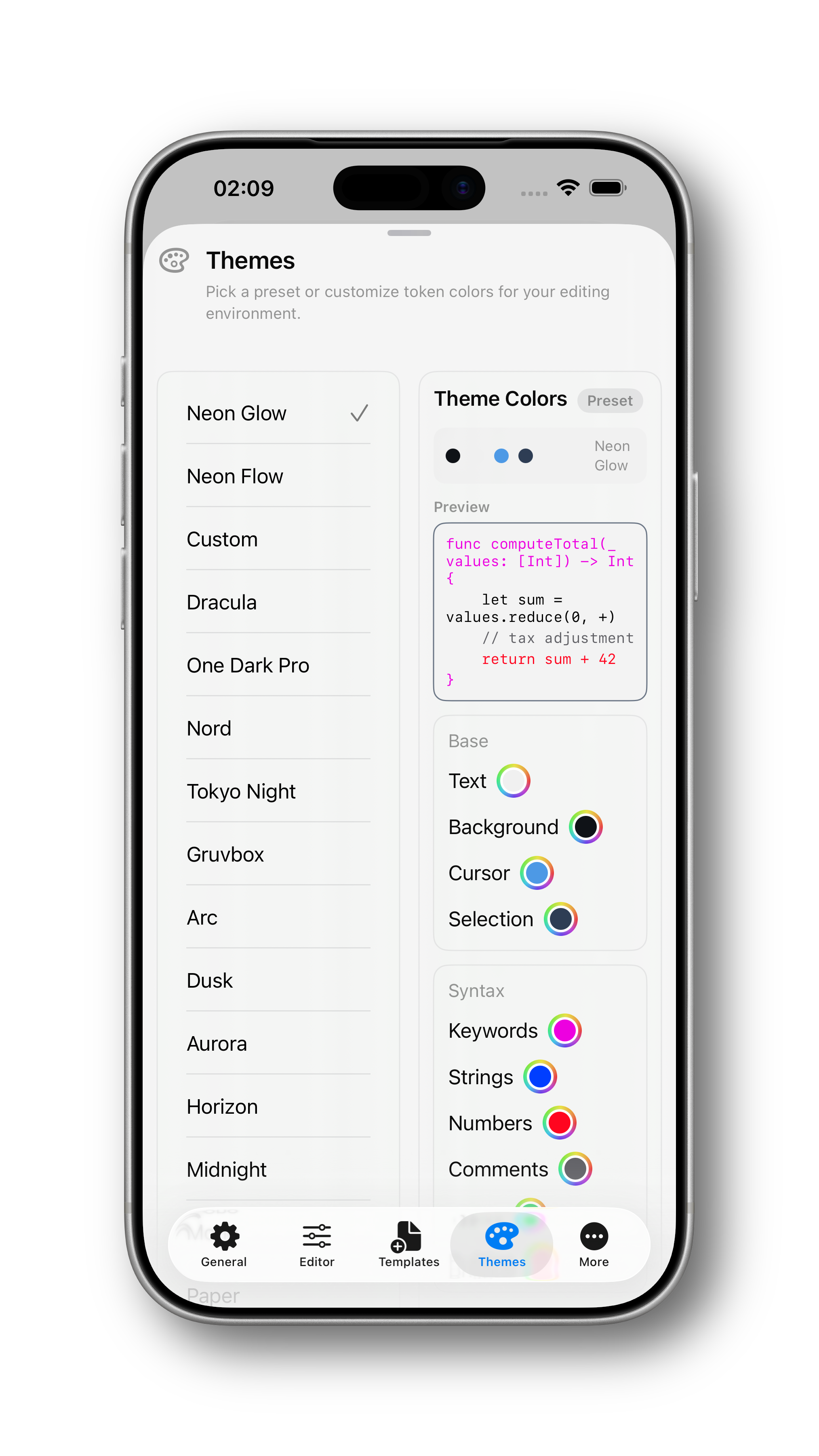 git clone https://github.com/h3pdesign/Neon-Vision-Editor.gitcd Neon-Vision-Editorxcodebuild -project "Neon Vision Editor.xcodeproj" -scheme "Neon Vision Editor" -destination 'platform=macOS,name=My Mac' buildopen "Neon Vision Editor.xcodeproj" and run, then use Cmd+P for Quick Open.| For | Not For |